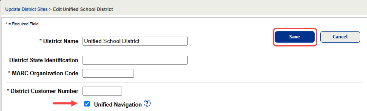 - To disable Unified Navigation, select District View > District Setup > Sites tab.